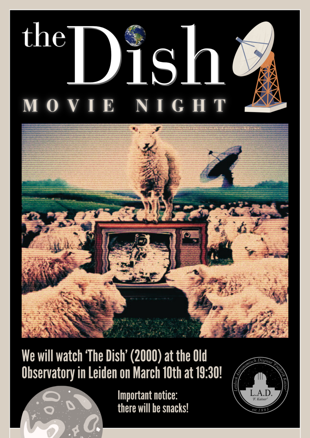 As Neil Armstrong set foot on the moon, our only link was a satellite dish in rural Australia with a few bugs (and a few hundred sheep).π We watched βThe Dishβ (2000) at the Old Observatory in Leiden on March 10thΒ atΒ 19:30ππππ. Although the movie featured less sheep than we had thought, we can highly recommend…