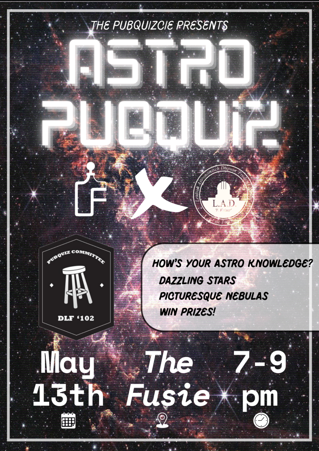 On the 13th of May, DLF’s PubquizCie held the ASTRO PUBQUIZ together with Kaiser — the most intergalactically epic trivia night in the observable universe! 🌠 From twinkling stars to mind-blowing nebulas, it was an evening of astronomical amazement, fueled by facts, fun, and fabulous prizes! 🏆💥